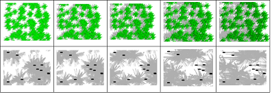 不同太陽角度下的冠層陰影(上:相機(jī)在冠層上部看到圖像,相機(jī)高度29米;下:相機(jī)在冠層下部看到圖像,其中黑色部分為樹干,相機(jī)高度4.5米。)